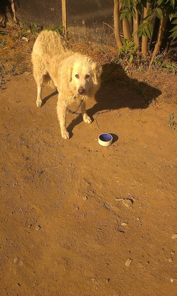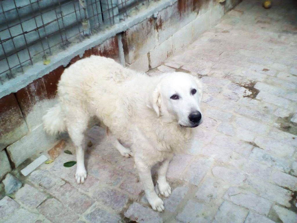 Wieder eine arme Socke mehr im Tierheim. Unsere Mitarbeiter fanden Zeno angebunden am Tor des Tierheims. Sein Halsband war so festgeschnürt , dass man es nur mit einem Messer durchtrennen konnte. Die spuren an seinem Hals lassen darauf schließen ,dass er das Halsband schon jahrelang getragen hat.. Zeno hatte schrecklcihe Angst vor unseren Mitarbeitern und es hat einige Zeit gedauert bis sie Zeno befreien konnte. Jetzt langsam fasst er Vertrauen. Unser Zeno hat sich zu einem menschenbezogenen Kuvasz entwickelt. Er teilt sich seinen Zwinger mit unserer Suzy auch eine Kuvasz Hündin. Zeno zeigt sich oft dominant und daher würden wir ihn gerne als Einzelhund vermitteln.