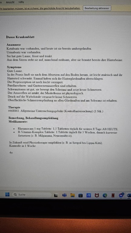 Leider konnte Dana letzte Woche auf einmal nicht mehr laufen. Daraufhin kam sie in ein CT. Bei ihr wurde eine Verkalkung (Spondylose) festgestellt. Sie bekommt nun Medikamente und Physiotherapie. Mittlerweile kann sie wieder gehen. Aber ewig lange Spaziergänge halten wir nicht mehr für möglich. Hier appellieren wir an ein älteres Ehepaar oder natürlich auch an ältere alleinstehende Menschen, die einen kleinen Garten haben, wo Dana nicht mehr so weit laufen muss. Kurze Spaziergänge gehen natürlich. Es wäre auch schön, wenn sie ab und an dann noch Physiotherpie bekommt :-). Wo finden wir die passenden Menschen für sie?? Noch ein eiskalter Winter in Ungarn wäre fatal für sie.